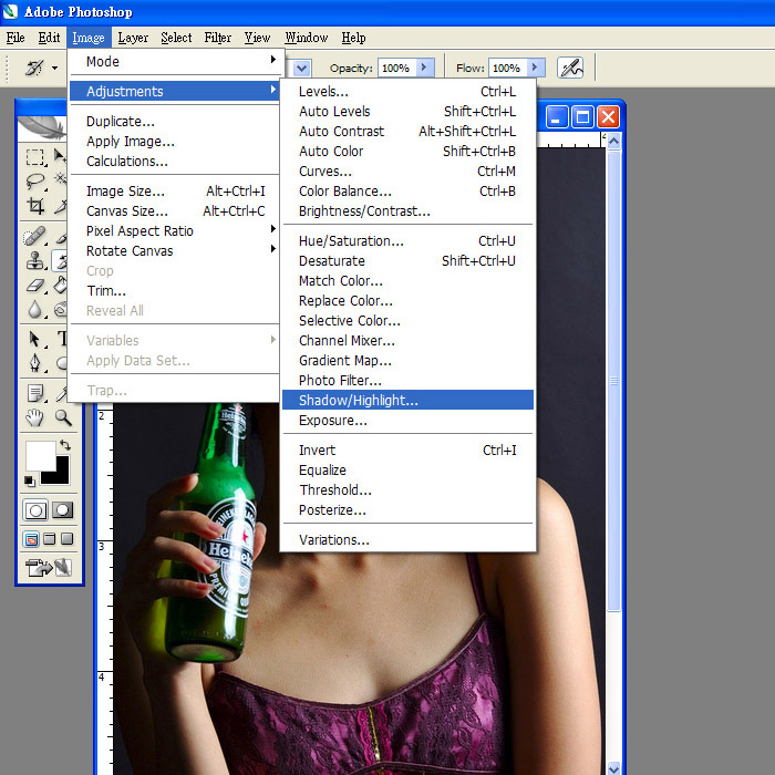 用image=>adjustment=>shadow/highlight調整暗位嘅Level..