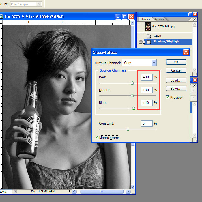 今次我用咗30%R, 30%G, 40%B... (記住揀monochrome)..