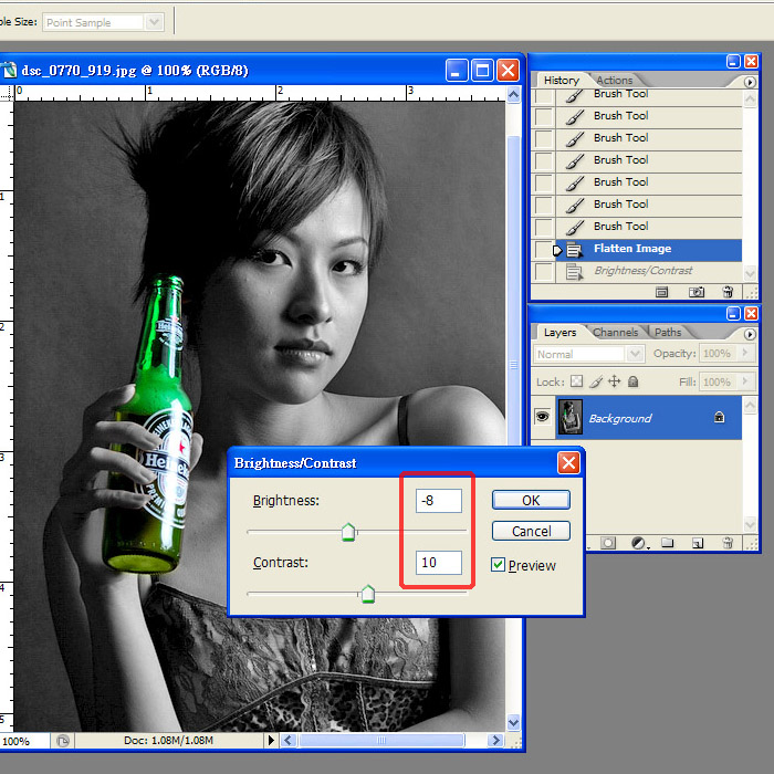 3. 用image=>adjustment=>brightness/contrast再加強黑白相嘅視覺質感..