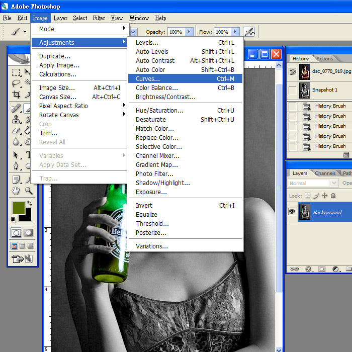 wyngo 寫:I want to change this picture into black & white, but leave the bottle in green, how can I do that in PS, any big brother can give me a hand? :sorry: :sorry: :sorry: