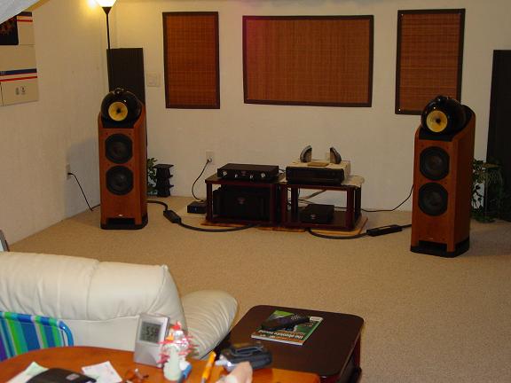 聆聽房大約四百平方呎...間隔不規刖..唔係長型也不屬四方形...按照廠方指引, 喇叭之間最少相離二公呎..大約6呎半...但為了使音場寬闊, 我拉開到八呎, 離後牆三呎半,左右兩牆各兩呎..角度微向內三十五度...立置方好..線也拉好..前後級在搬動喇叭位置時己經煲了個小時....準備放我第一隻試音CD...FIM Super Sound..XCRD 24bit.. 首曲係卡门..但係用古典結他和大小提琴伴奏...一開聲,我就開始皺眉頭了,高音尖銳粗糙,中頻不飽滿,低頻鬆散...再播第二首"秋思" 此曲係著名古樂..任白帝女花之香夭也就是此曲改編...全曲之音頻由高到低..快慢急停..如高山流水般..對器材之考驗相當嚴勵....但此時在我面前只有吵耳之高音..金屬声此起比落....彈指之声也被過量低頻浸沒....最後試人声..Diana Krell..之stepping out. 總算人声也可以...無令我失望....但整體表現正如我先前從其他用家所得嘅資料一樣...由於金屬高音單元故此..有剌耳感覺....