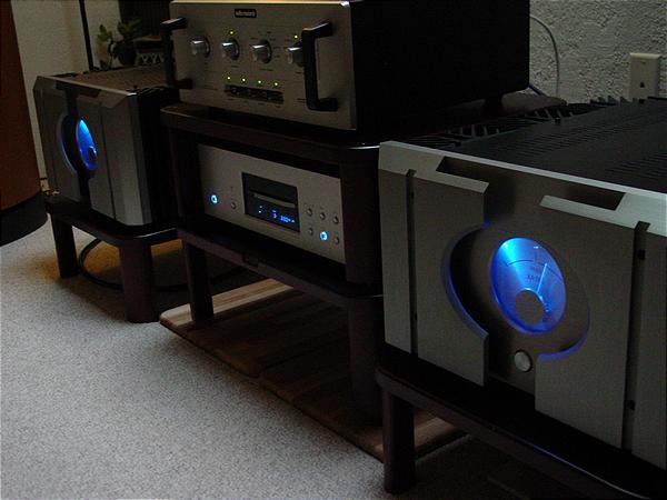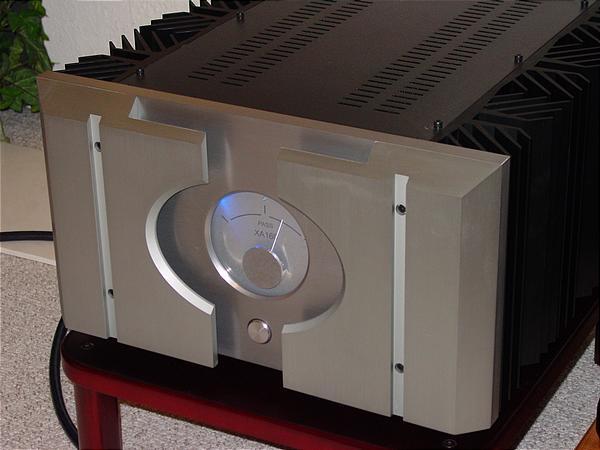 > 機身很重達150lbs一隻, 外轂質料及手工都是一等水準, 前面正中有藍灯表板, On/Off 也在正中, 機後可駁兩組喇叭線, 平衡與非平衡輸入, Stand By 制也在後面, 當Stand By On 時, 前面表板只現一點藍灯. 表示Power Stand By Mond.