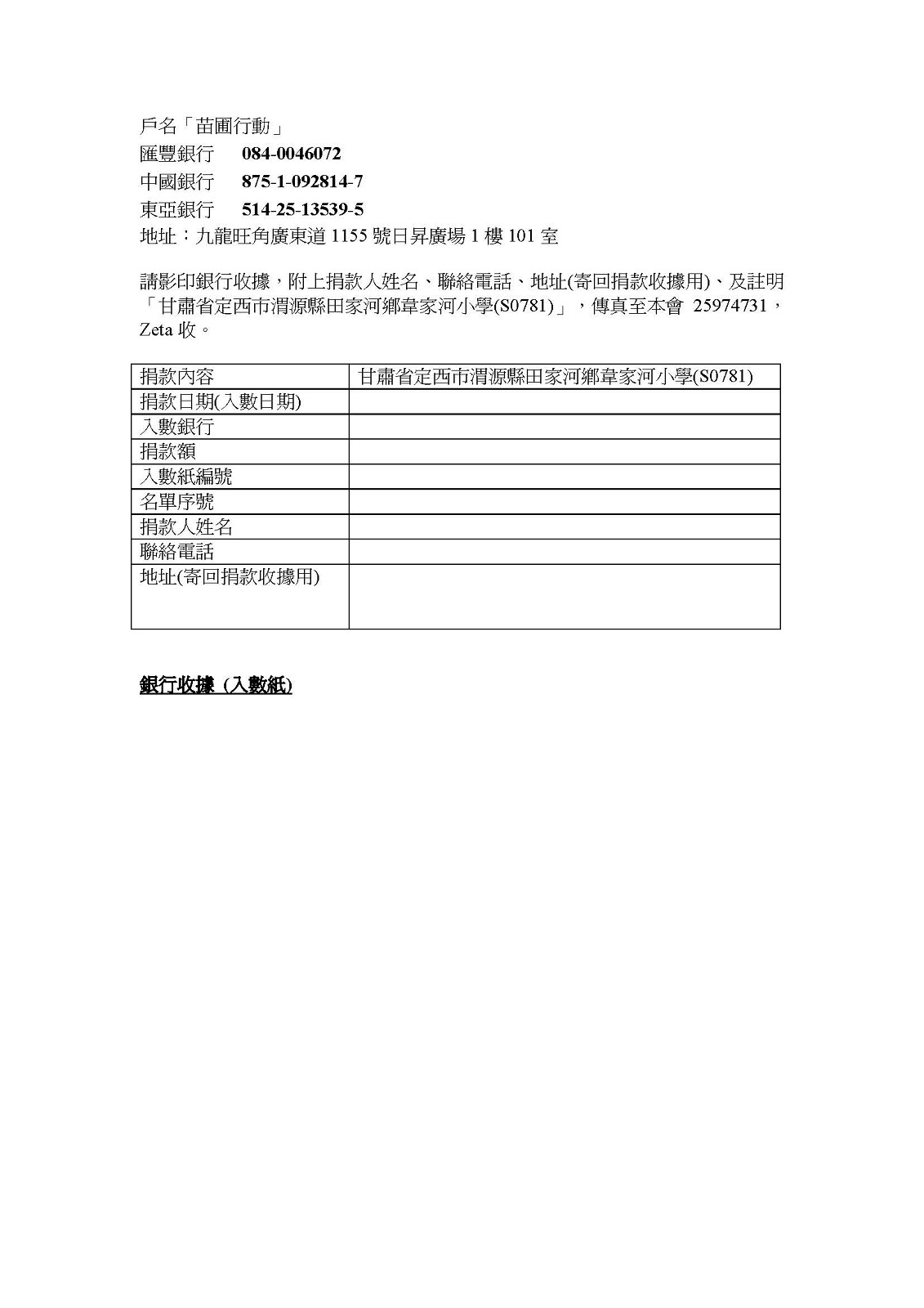 5) 請於 8月18至8月20將"捐款表" fax去 25974731 苗圃行動 Zeta 收