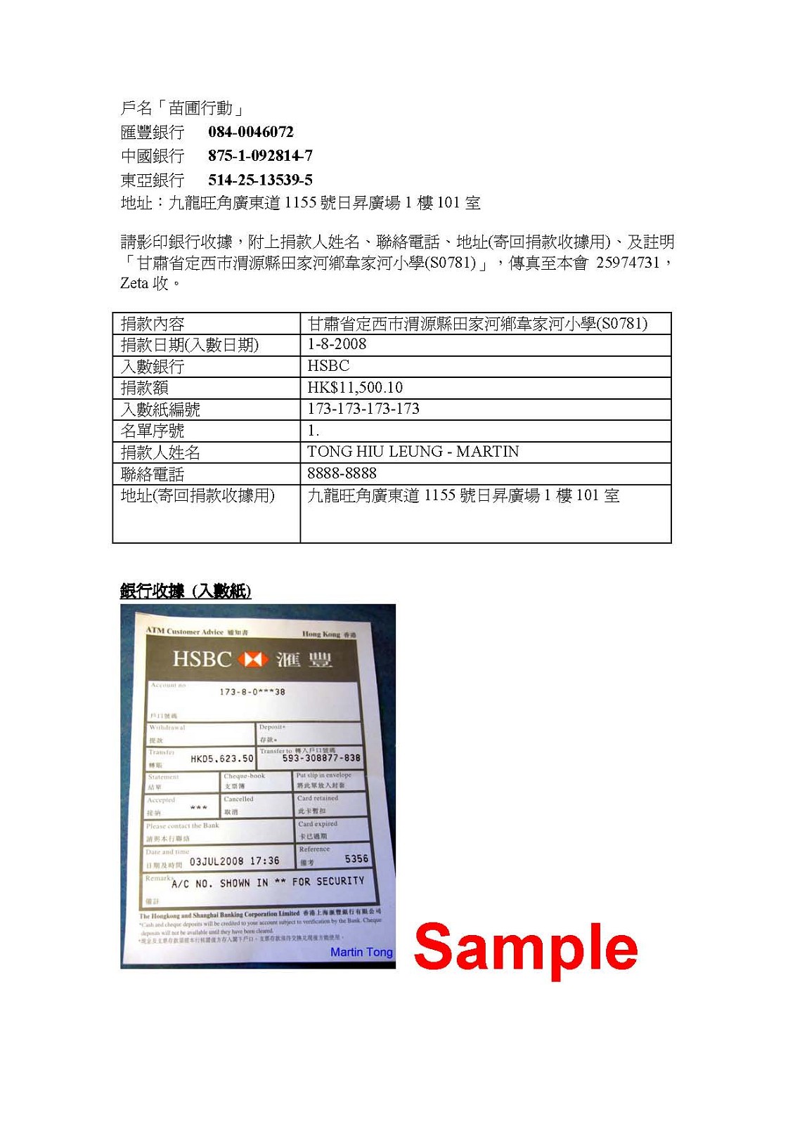 捐款表: 請email給MARTIN取 martintong100@yahoo.com.hk
