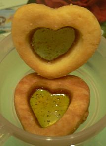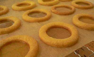 原來玻璃喺指挖空曲奇中心, 放半粒霍士糖入去一齊焗, 粒糖溶咗再凝固後就有"玻璃窗"效果, 真刁鑽