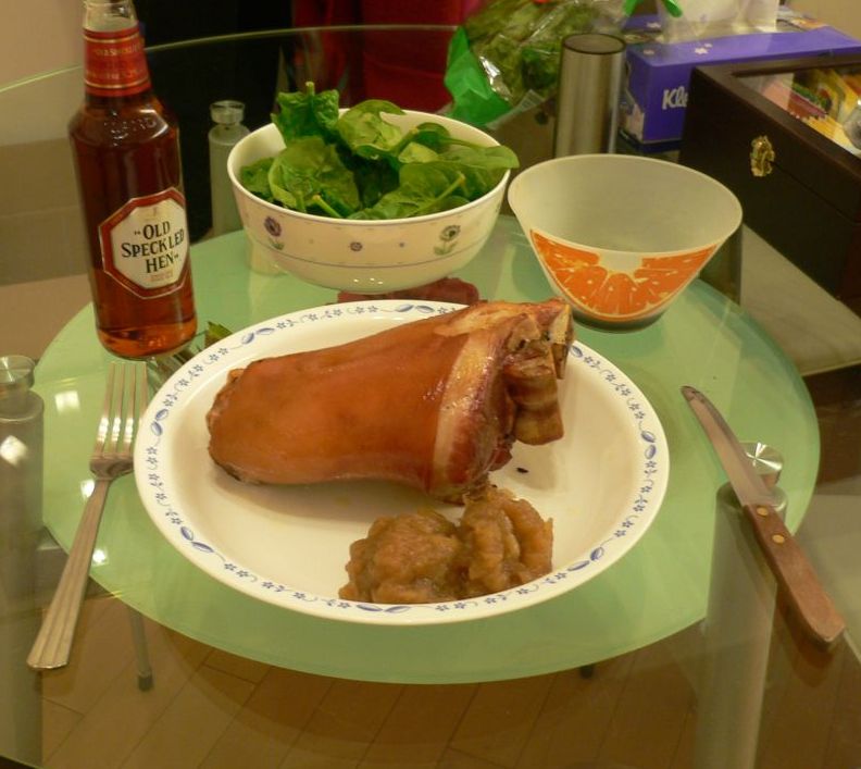 焗完出黎就有得食啦. 加啲酸蘋果醬, 加啲菜 (見到雪櫃有黑醋, 有松露橄欖油, 啱晒, 開返個 source 先), 當然唔少得啤酒....冇德國啤, 整支英國啤頂住先