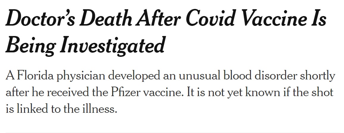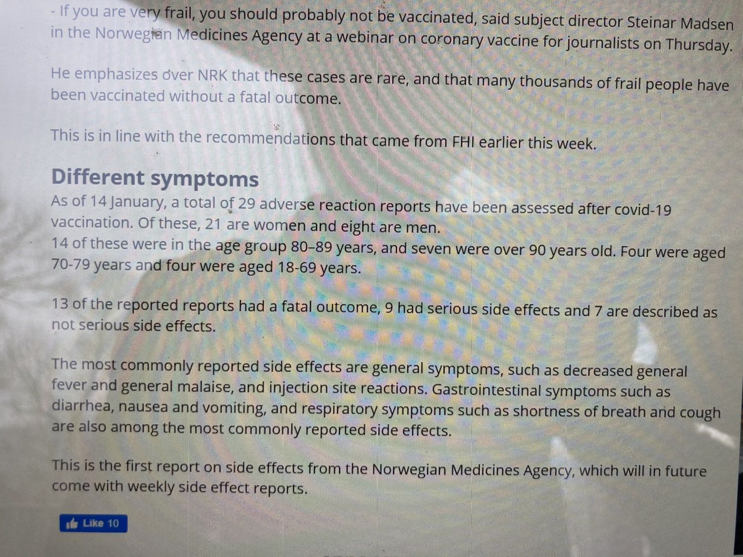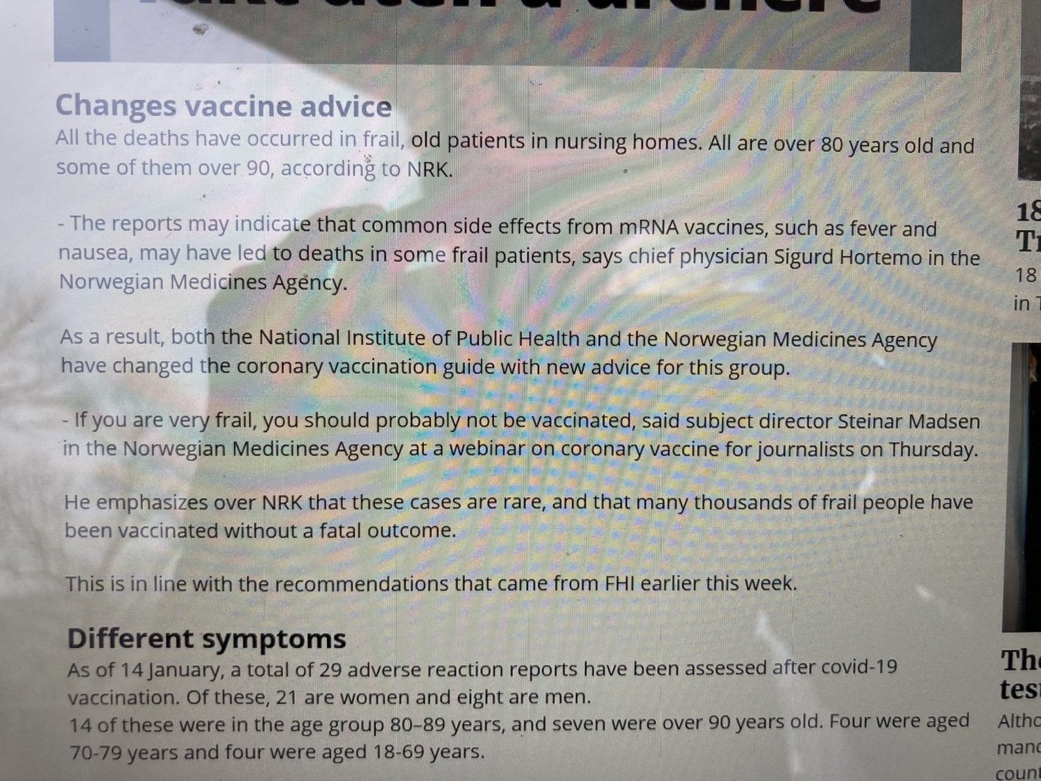 13 deaths, all elderly people, + 9 having serious side-effects, and 7 less serious side-effects so far in Norway, after giving about 25k Pfizer-Biontech vaccines against Covid-19.
