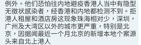- "蛋壳公寓" 等集团式 "包租公" 爆煲后,住宅租盘供应整体话说增加了,稍稍拉低各大城市住宅租金。目前就算在唐家湾这个有城轨站兼高校和新经济中小企聚集的旺区,两房两厅月租三千至三千五人仔仍有不少选择,三房两厅一百至百一平方左右的预四千五至五千人仔月租左右,而且是直接向业主租,而非经 "蛋壳公寓" 这类中间人。唯一较痲烦的是,部分业主和酒店不肯或不敢租给香港人,有居住証者例外。他们恐怕往内地避疫香港人当中有隐型无徵状感染者,经香港和内地都检测不到。拒港人租屋和酒店房这现象珠海相对少,深圳,广州及大湾区以外的城市更严重,特别是北京,因据闻最近一个月北京的新增本地个案源头来自北上港人