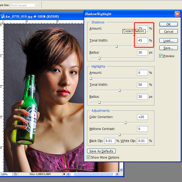 用image=>adjustment=>shadow/highlight調整暗位嘅Level..