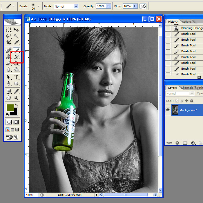 wyngo 寫:I want to change this picture into black & white, but leave the bottle in green, how can I do that in PS, any big brother can give me a hand? :sorry: :sorry: :sorry: