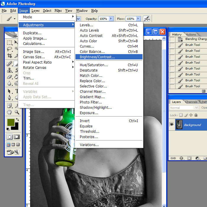 3. 用image=>adjustment=>brightness/contrast再加強黑白相嘅視覺質感..