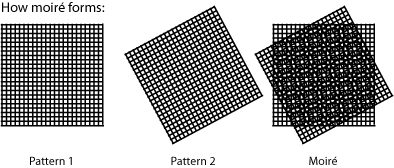 Sometimes odd stripes or colors will appear in a digital image, either from a high-end digital camera, or from a scanned image. This effect is called moiré and is caused when a fine pattern in the subject (such as the weave in a fabric or very close, parallel lines in architecture) matches the pattern of the imaging chip. When two patterns meet, often a third, new pattern is created. This third pattern is called moiré. Notice in the illustration below the round, circular patterns (on the right) created as the two grids are combined; this is moiré.