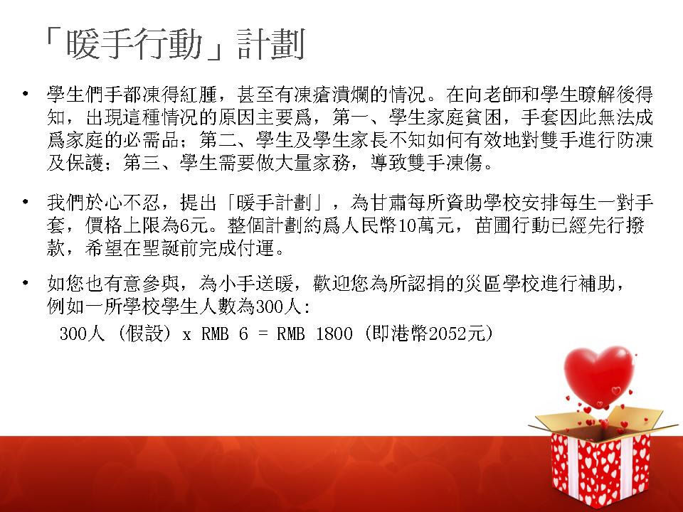 歡迎您為所認捐的災區學校進行補助,參加「暖手行動」計劃。