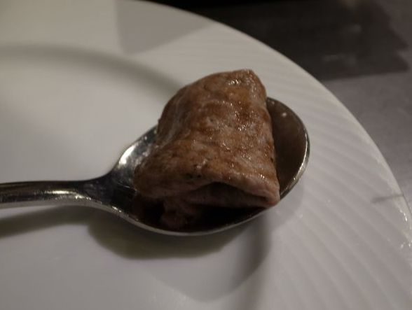 用薄片牛肉包住鵝肝醬, 供一口吃掉!