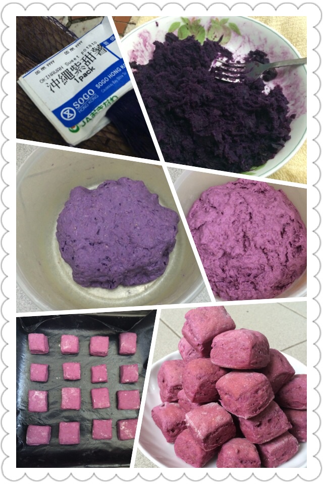 第一次做,其實只是免揉麵團加入了紫番薯蓉,再把麵團切成2cm x 2cm 的小方塊。