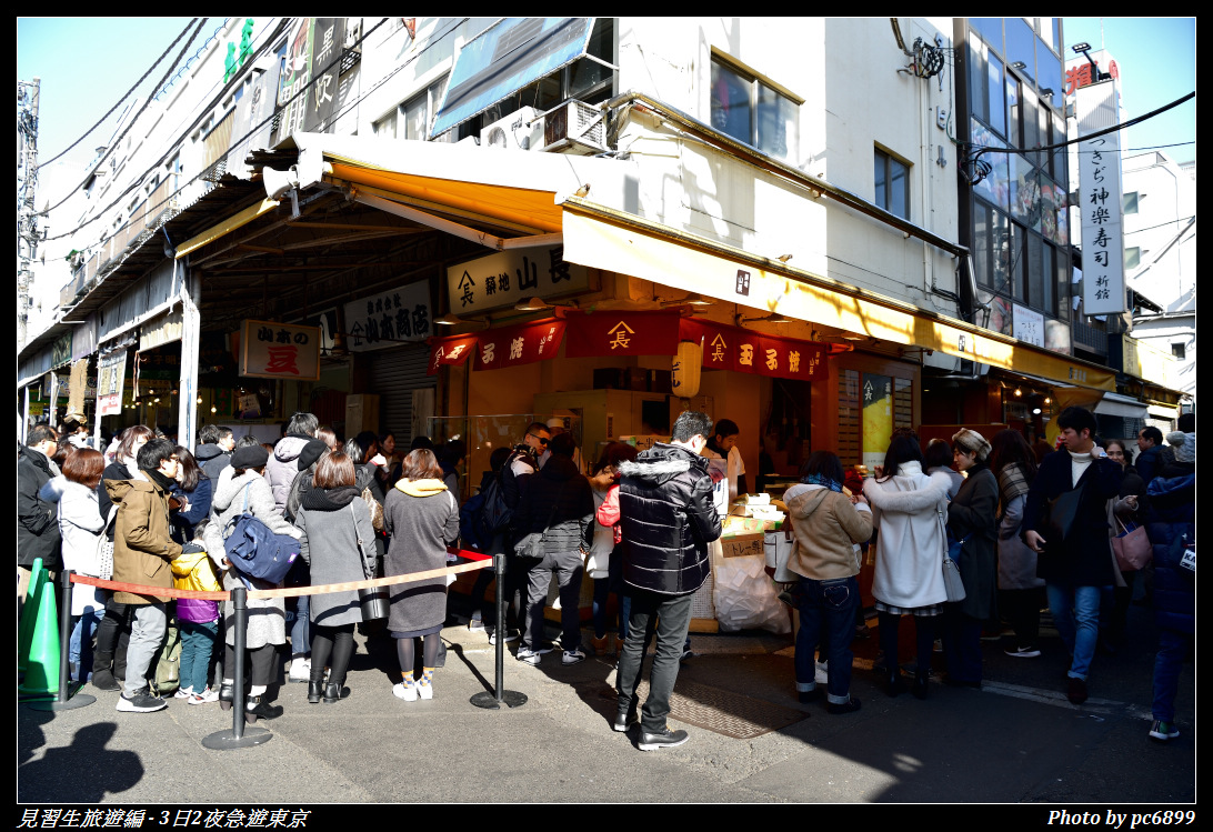, 但係個個都話嚟築地要試吓D魚生同壽司, 間間都排晒隊, 是旦搵間啦, 都要係門口等左半粒鐘