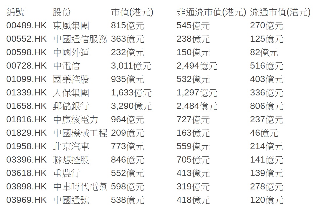 - 搵晒所有響 HK 上市的 H 股,當中未有 A 股響內地上市的。遂間睇睇佢地既股權結構,看看大股東持有的是否未能流通的內資股,應該唔止文中提及中航國際控股(161)一家。