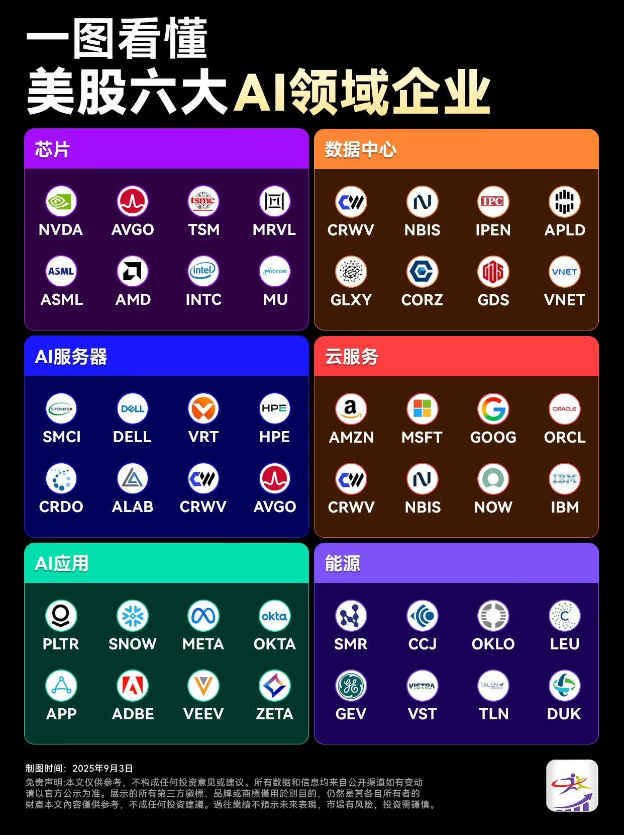 - #AVGO (Broadcom Inc.): 半導體巨頭,提供網路晶片、交換器和光學元件,用於 AI 資料中心的互聯和高速 Ethernet,支持資料爆炸成長的基礎設施建置。YTD: +45.23%。