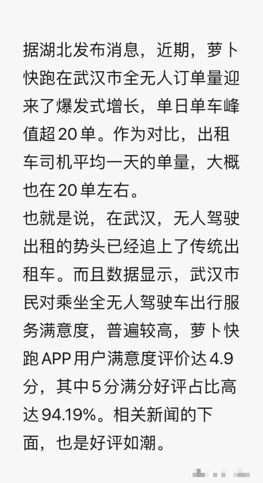 最近,武汉“萝卜快跑”投入了一万多辆出租车,仅仅几个月就接单5百万。订单这么猛,一下把整个武汉网约车司机都打懵了。