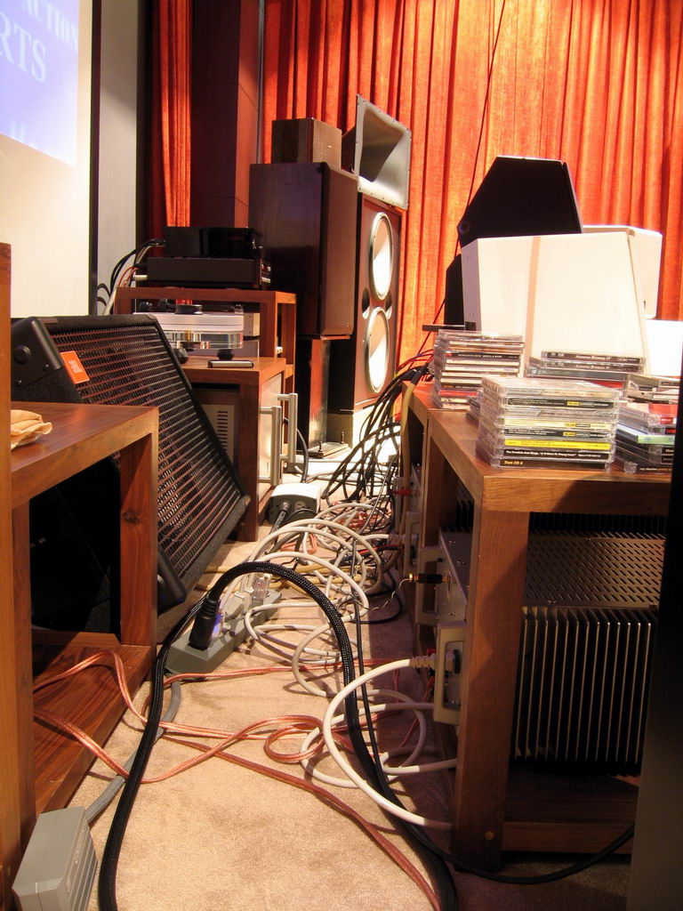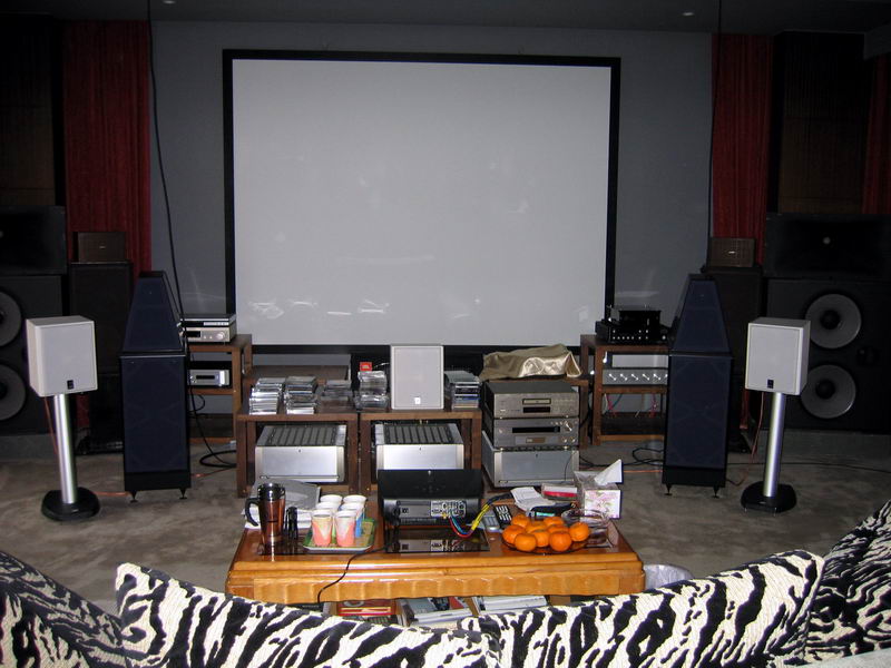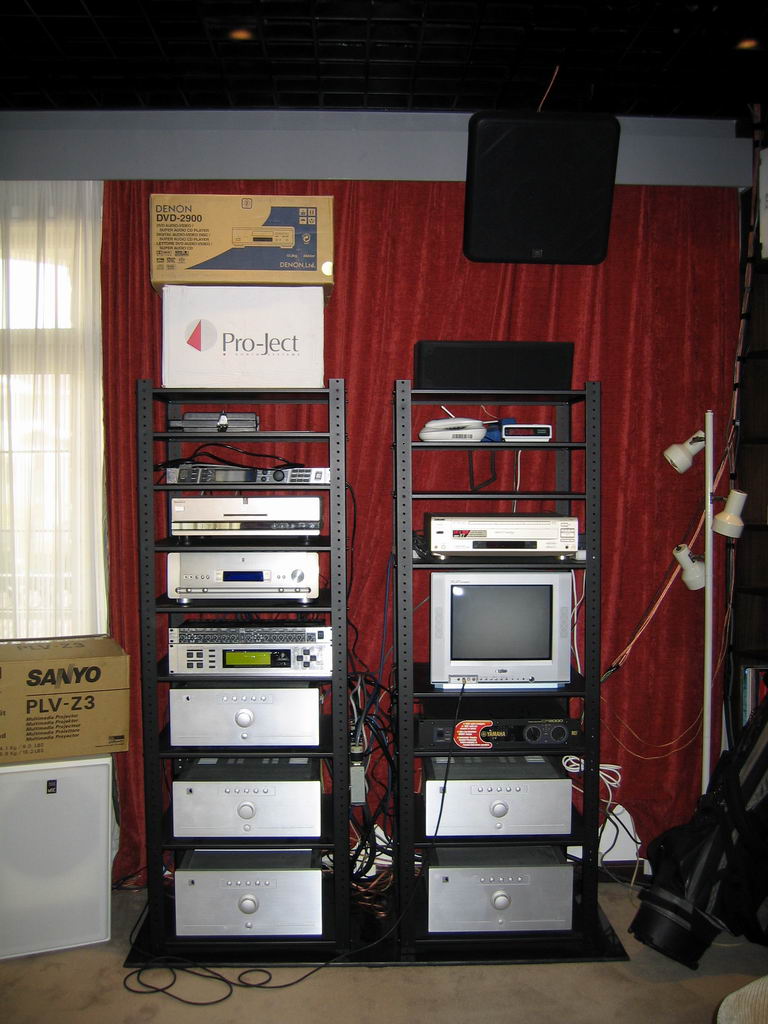 All the equipment are packed and spread around the front (2 rows of racks), right (high level HiFi rack) and left (hugh JBL subwoofer).