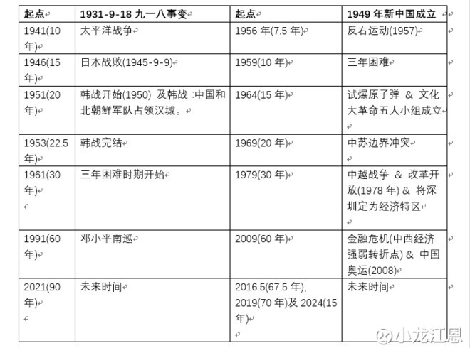 如江恩經常引用聖經「太陽之下並無新事。」在表中,利用江恩理論三十年分割,得知過去中國在相關年份,皆有重要事件發生。由1931年的「九一八事變」開始,10年後的太平洋戰爭(1941年)、15年後的日本戰敗(1945-9-9)、20年後的韓戰開始(1951年)等。