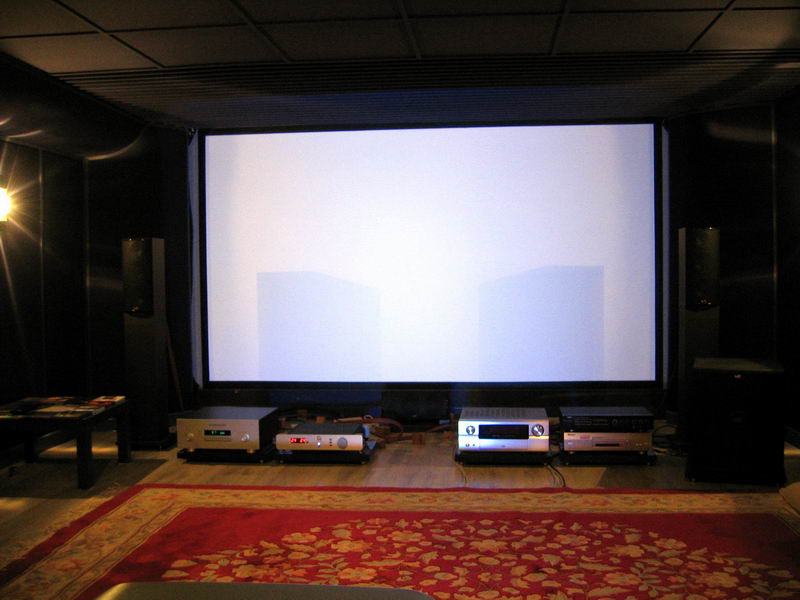 The screen is also made up by Tony himself using a 150" Da-lite 4:3 manual pull as raw fabric of 2.8 high gain power. He cut the fabric and mounted it with stainless steel grid supporting frame into a fixed 133" 16:9 screen with a viewing angle of 16 degree which just fit his AV room.