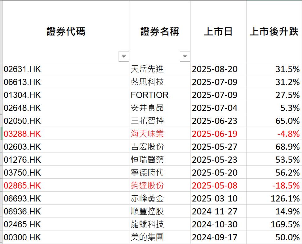 大家有時間可以記低以下新加入名單個堆公司中,上市未夠半年個批,自 2025-8-22 至今的表現,以及它們的 "配售結果" 公告,對以後補捉邊隻新股會炒上或有些幫助。