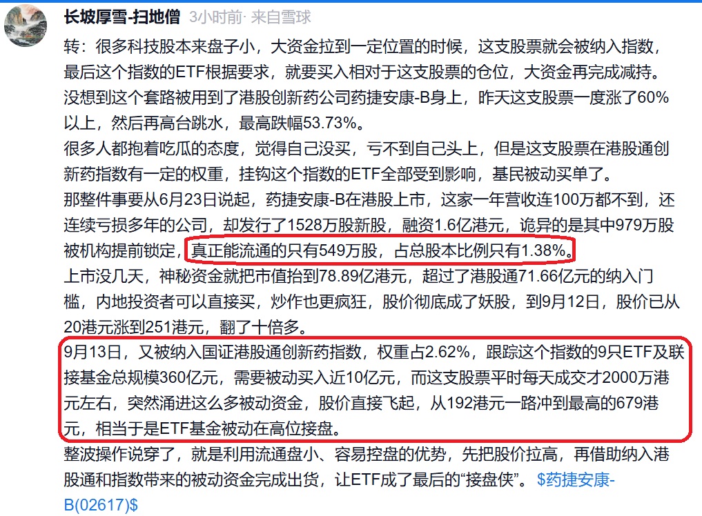 这个不合理的纳入导致所有被动配置港股创新药ETF的基金,直接被推到台前当接盘侠。