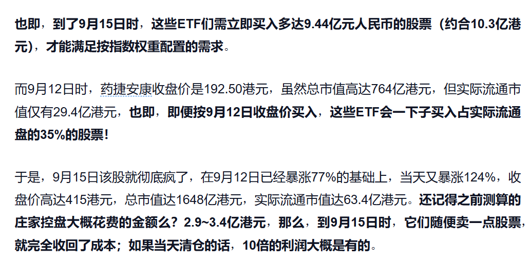 药捷安康就是硬性规则的典型翻车:市值指标勉强够,流通盘和交易活跃度却远远不行。结果ETF被逼无奈,投机者笑到最后。